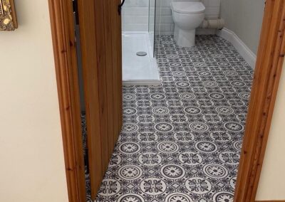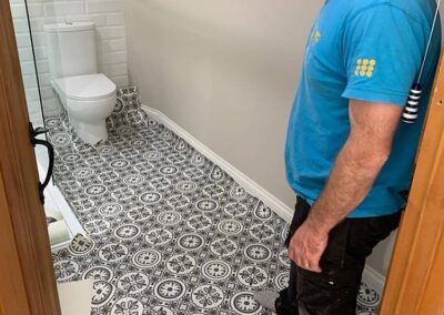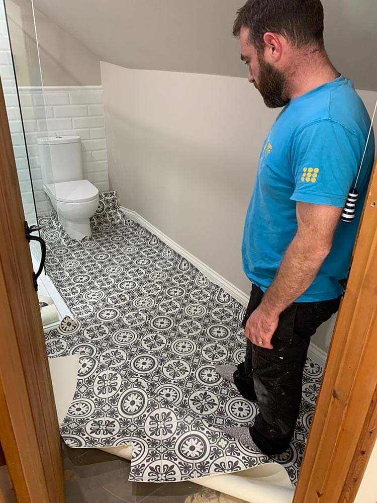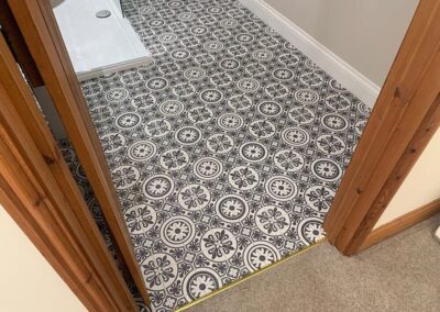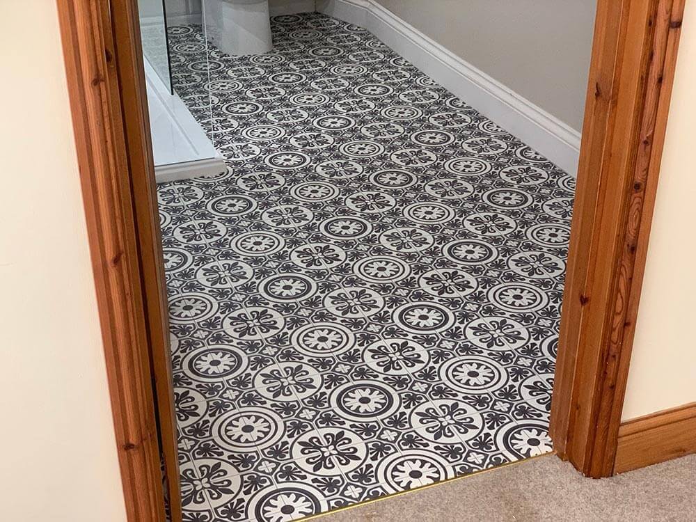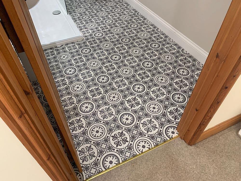Bathroom Patterned Vinyl JM Carpets supply and fit hard wearing patterned vinyl flooring JM Carpets supplied and fitted this bathroom patterned vinyl floor in a small shower room. We can supply and fit carpets, vinyl and other flooring solutions in just one room or throughout your whole property.